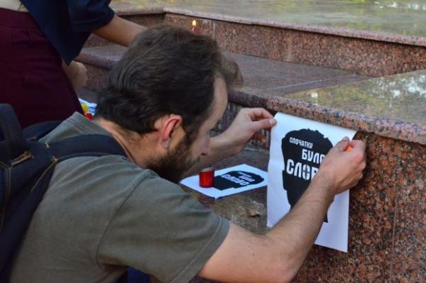 На акції виступив журналіст Євген Гапич, який торік три дні перебував у полоні сепаратистіву Слов’янську. Справа його викрадення вже півтора роки спущена на гальмах. По цій справі, каже Євген, більше доказів зібрали журналісти, аніж працівники МВС.