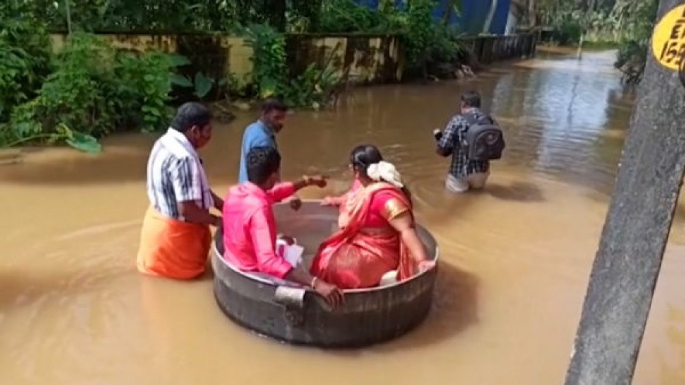 В індійському штаті Керала пара з міста Аллеппі вирішила не скасовувати весілля через негоду, і припливла на свято у величезній каструлі.