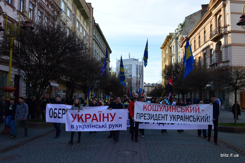 Опісля учасники віче урочистою ходою пройшли середмістям Івано-Франківська до Меморіального скверу. З собою прикарпатці мали кількаметрові синьо-жовтий та червоно-чорний стяги та банери з гаслами "Ні підкупу виборців!", "Обери нову владу!", "За гідне життя!", "Україну в українські руки!" "Єдиний вибір українців - Руслан Кошулинський!".