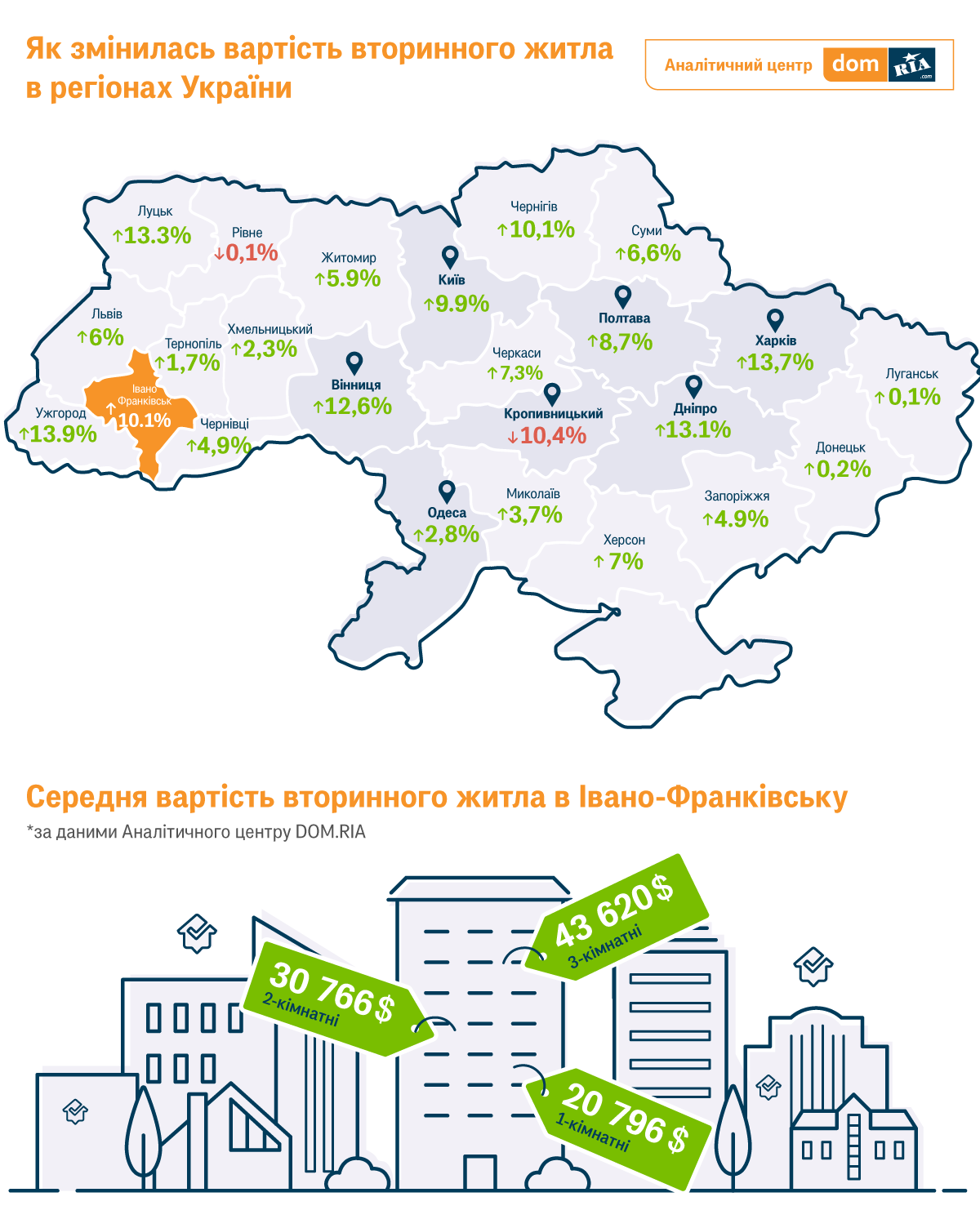 Вторинна нерухомість продовжує дорожчати. За останній рік ціни виросли на 6,7%. В Івано-Франківську вона подорожчала в середньому на 10,1%, або на $2 866.