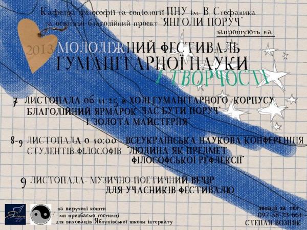 Також у рамках фестивалю 8-9 листопада проходитиме Всеукраїнська наукова конференція студентів-філософів та молодих науковців «Людина як предмет філософської рефлексії». У ній візьмуть участь студенти та викладачі філософського факультету ПНУ ім. В. Стефаника, а також гості з університетів Києва, Луцька, Дніпропетровська, Львова, Дрогобича та Сімферополя. А 9 листопада учасники фестивалю зможуть взяти участь у музично-поетичному вечорі.