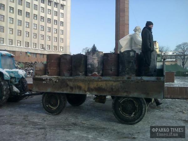 Сьогодні, зранку від адмінприміщення обласної ради вантажна машина забрала металеві бочки, які мітингувальники використовували для обігріву.