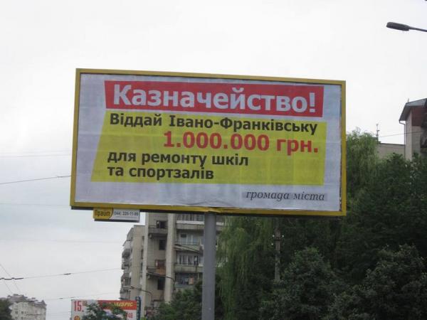 На вулицях м. Івано-Франківська з’явилися біг-борди із закликом до Державного казначейства віддати кошти на ремонт шкіл і дитячих садків, ремонт ліфтів у житлових будинках.