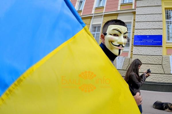 Близько 50 молодих людей вийшли під стіни будівлі обласної міліції з гаслом «Міліція - з народом, «менти» - з уродом». Деякі з протестуючих були у масках Гая Фокса.