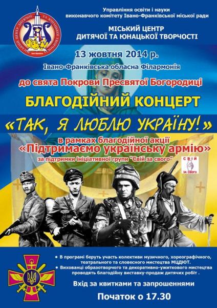 13 жовтня у приміщенні обласної філармонії о 17.30 відбудеться благодійний концерт за участю колективів Міського центру дитячої та юнацької творчості під назвою „Так, я люблю Україну”.