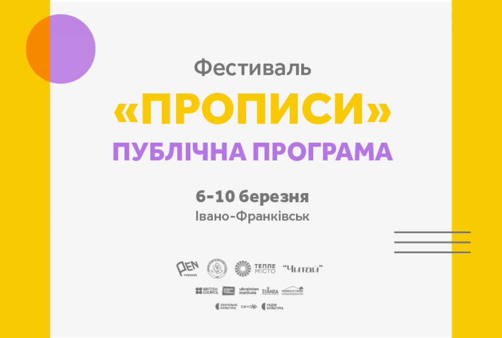 6–10 березня у Івано-Франківську відбудеться другий фестиваль-воркшоп для молодих авторів "Прописи". Протягом п’яти днів заплановані події для всіх, хто цікавиться сучасною українською культурою, та закрита професійна програма для молодих авторів.
