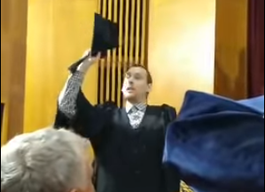 Перебуваючи внизу, молодий чоловік прокричав: "350 доларів я заплатив за диплом, працював у Польщі. Спасибі, велика честь..". Після цього його виштовхали з актового залу. За словами очевидців, хлопець був п'яний.