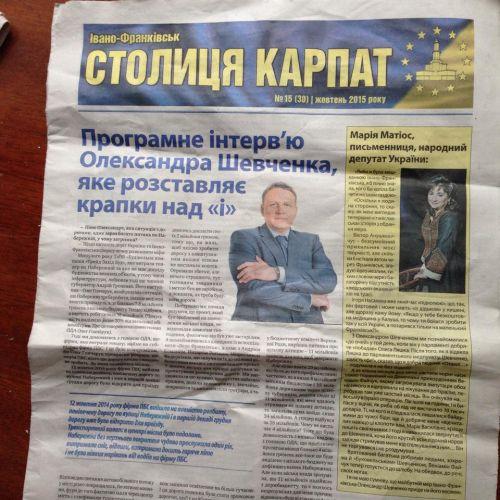 Матеріал із позначкою «на правах реклами», в якому Матіос агітує за народного депутата Шевченка, днями з’явився у місцевих друкованих виданнях, а також у жовтневому випуску газети «Столиця Карпат», яка друкує матеріали на підтримку партії УКРОП та кандидата Шевченка, пише Галичина.