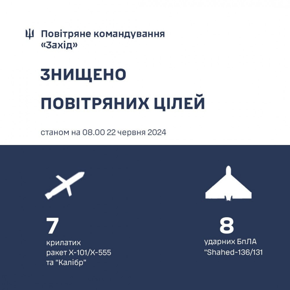 Як повідомили в Повітряному командуванні "Захід" вночі 22 червня в ході відбиття російського комбінованого ракетно-авіаційного удару по об'єктах критичної інфраструктури зенітні ракетні підрозділи, авіація та мобільні вогневі групи повітряного командування «Захід» в зоні своєї відповідальності знищили 7 крилатих ракет Х-101/Х-555 та «Калібр» і 8 ударних БпЛА типу «Shahed-131/136».
