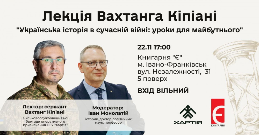 "Модеруватиме подію історик, доктор політичних наук, професор, пластун Іван Монолатій. Чекаємо всіх зацікавлених у Книгарні "Є" в Івано-Франківську, вул. Незалежності, 31, 5 поверх. Також у Книгарні "Є" можна буде придбати книжки Вахтанга Кіпіані з автографом", - зазначають організатори.
