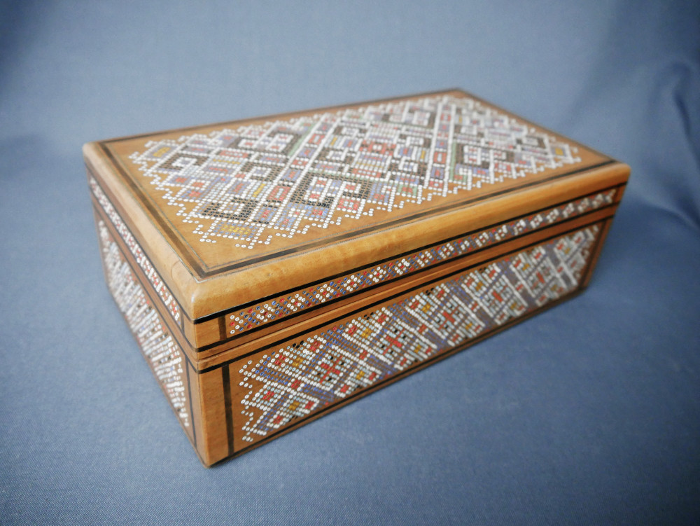 Цей стиль порівнюють з ювелірним мистецтвом. Майстри використовують перламутр, бісер та різні породи дерева. Кожен елемент вирізається вручну, вставляється в точно відповідний отвір, створюючи складні геометричні композиції. У кожному виробі сотні дрібних деталей, що складаються у візерунок, мов розкішна мозаїка.