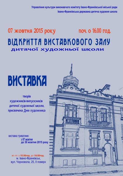 7 жовтня 2015 року о 16.00 год. відкриття оновленого виставкового залу Івано-Франківської державної дитячої художньої школи та виставку творів художників-випускників нашої школи.