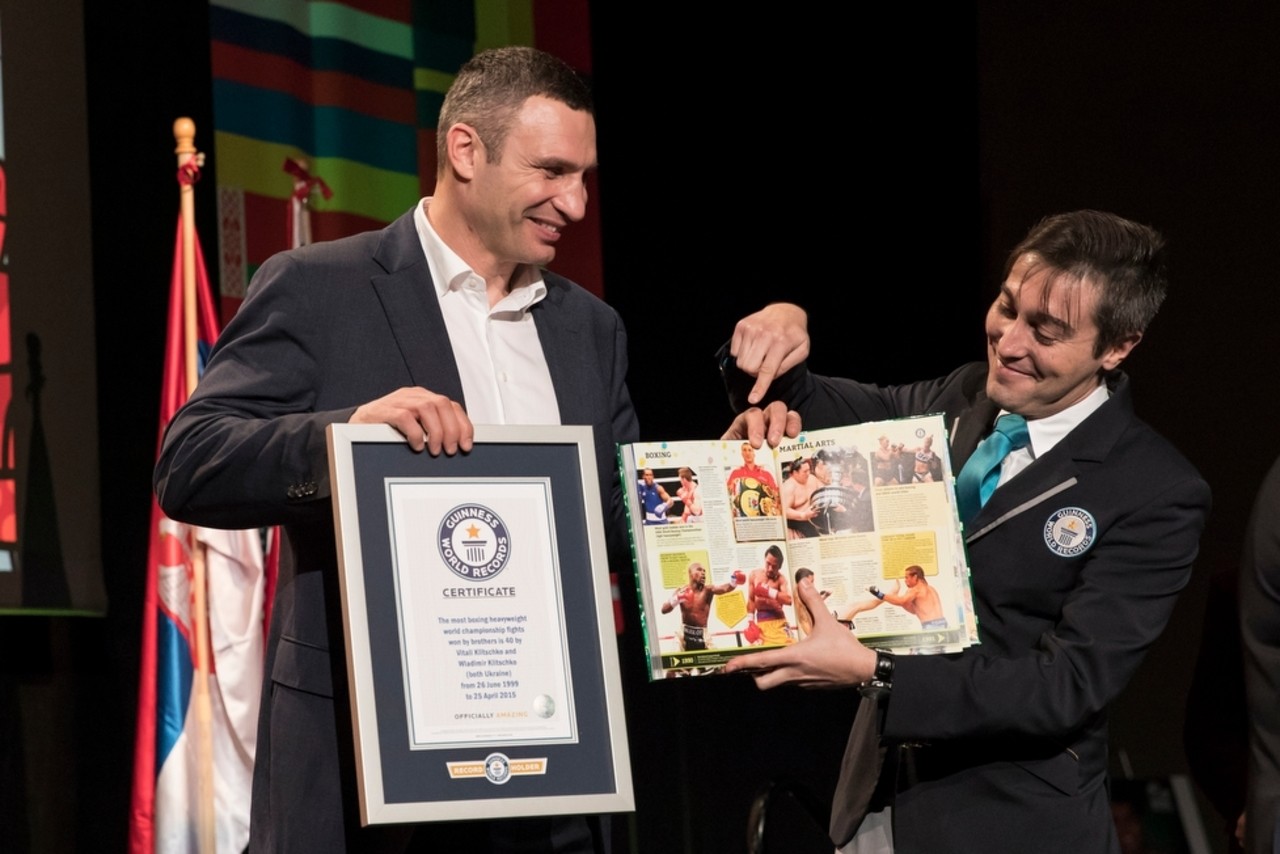 Також Віталія і Володимира Кличків відзначили сертифікатом Книги рекордів Гіннеса за те, що брати виграли 40 боїв у суперважкій категорії з 26 червня 1999 року по 25 квітня 2015 року.