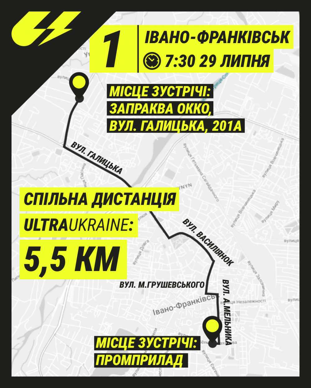 Ввечері. О 17:00 рушимо з Промприладу на виїзд з міста в бік Тисмениці. Спільний трек — 5 км. Маршрути: