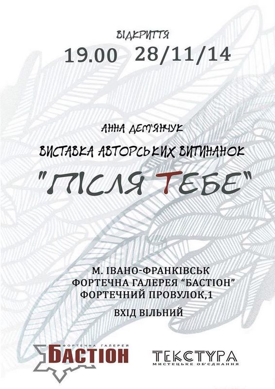 28 листопада о 19.00, відкриття виставки авторських витинанок Анни Дем'янчук "Після тебе". Виставка триватиме до 11 грудня.