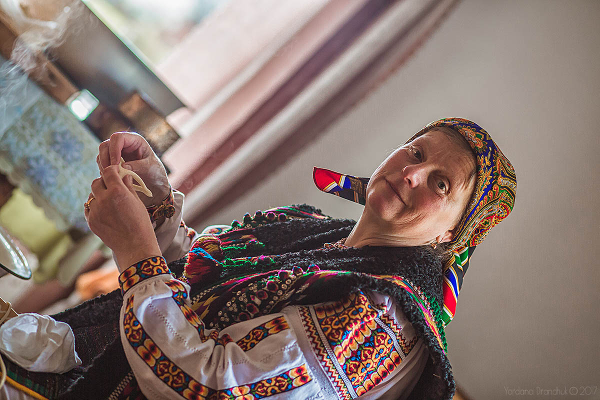 За мить приходить і сама майстриня, вдягнена в гуцульський стрій, помітно, що вдягає вона його часто, бо почувається в нім легко і невимушено, а чоловік допомагає зашнуровувати китиці на рукавах.