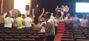 Захід починається бадьорою піснею соліста і двох хористок. Музика дещо нагадує кантрі. Поступово з крісел починають підводитися люди. Після третьої пісні народ в залі починає пританцьовувати, дехто підспівує. Чоловік позаду бубонить неіснуючою мовою і закочує очі. Своєрідне психологічне зараження починає діяти майже на всіх у залі. Першими починають співати, плакати та молитися ті самі люди. Виглядало, що вони робили це просто за змовою. Один з адептів, помічаючи, що кореспонденти КВ не танцюють разом з іншими, просить підвестися та вслухатися уважніше в мелодію.
