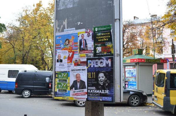 Окрім того особливої уваги заслуговує прихована агітація з біг-бордів у середмісті Франківська. Хоча на самому борді немає прізвищ, проте використані партійні кольори і лозунги з якими кандидати в міські голови ішли на вибори.