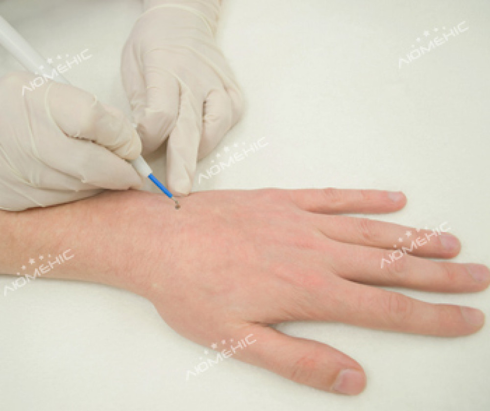 Безконтактна резекція бородавок за допомогою радіохвильового ножа. Рекомендована для обробки делікатних зон та вегетацій середнього розміру.