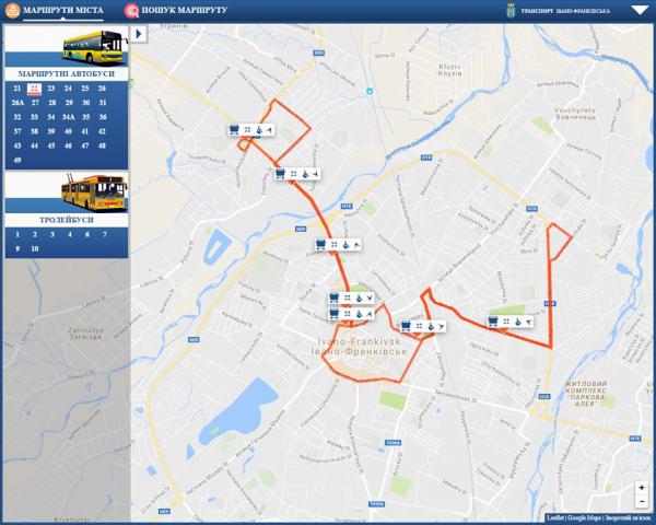 Автобуси які пристосовані для перевезення людей з обмеженими фізичними можливостями позначені спеціальними піктограмами на сайті https://city.dozor.tech/ua/iv-frankivsk/city