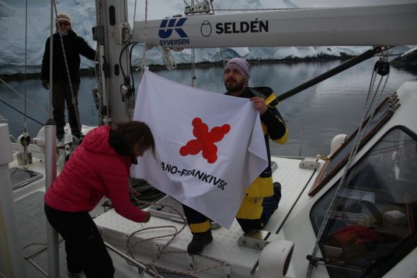 До Антарктиди мандрівники дійшли напередодні Нового року — зранку 31 грудня. Тут і була перша висадка, перші пінгвіни. Тут Юрій Филюк урочисто повісив прапор з логотипом Івано-Франківська. І далі вже експедиція проходила під двома прапорами — українським і франківським.
