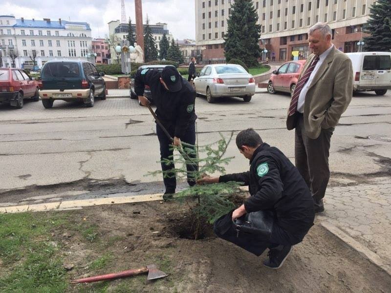 Вчора інспекторами Муніципальної інспекції з благоустрою за сприяння та спільно з першим заступником директора Українського науково-дослідного інституту гірського лісівництва імені П. С. Пастернака Коржова Володимира Леонідовича, як альтернативу антипаркувальним стовпчикам для запобігання нанесення шкоди зеленим насадженням, було висаджено ялини поруч обласної адміністрації на проблемній ділянці.