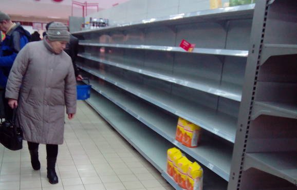 Різкі стрибки курсу української валюти в останні дні спровокували справжній ажіотажний попит на продовольчому ринку. Полиці магазинів у буквальному розумінні цього слова спорожніли, чого ми не бачили уже, здається, років з двадцять. Будь-які розмови між українцями так чи інакше стосувалися курсу долара, вартості бензину та здорожчання продуктів харчування.