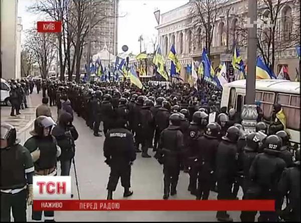 Не зважаючи на те, що під будівлею Ради також проходив мітинг прихильників Партії регіонів, а весь квартал довкола парламенту кільцем охопили правоохоронці, сутичок під будівлею не було. Мітингувальники активно спілкувалися з "беркутівцями" та кидали в них цукерки. Нагадаємо, раніше спікер Ради Володимир Рибак закрив ранкове засідання Ради.