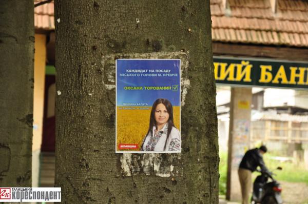 Біл-бордів, сіті-лайтів стає «замало» беруться до електричних стовпів, дерев, металевих каркасів реклам і знаків, під’їздів та парканів, пише Галицький кореспондент. Цим зловживають кандидати на посаду міського голови: Андрій Дзвінчук та Оксана Торованин. Хоча в центральній частині міста, навпроти будівлі міськвиконкому, розміщується великий дерев’яний стенд, який безпосередньо призначений для розміщення партійної та передвиборної реклами. Та він чомусь й надалі пустує, хоча за декілька метрів стовпи заліплені.