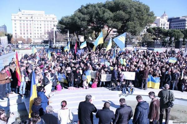 Мітингувальники виступають із одним зверненням, перекладеним різними мовами світу, у якому зокрема засуджують застосування сили проти мирних демонстрантів у Києві, повідомляє Радіо Свобода.