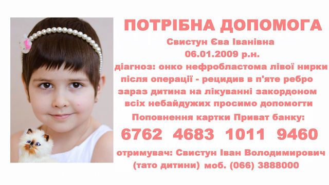 Цій маленькій дівчинці всього 5 років та за 2 останні роки вона перенесла 11 курсів хіміотерапії та операцію з видалення нирки, які проводились в Україні. Та, на жаль трапився рецидив і хвороба знову повернулась. Зараз дитина перебуває на лікуванні закордоном, а саме в Італії. Там їй вже провели перший блок хіміотерапії і має пройти другий. Та, на жаль, у батьків немає на нього грошей. Тому вони звертають до небайдужих людей з проханням про допомогу. Євочка дуже життєрадісна дитина і батьки вірять, що з Божою допомогою вони здолають хворобу!