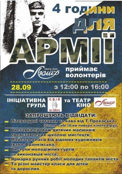 Акція триватиме з 12 до 16 год. Зароблені кошти підуть на допомогу українській армії. Кординатор - ініціатива "Свій за свого".