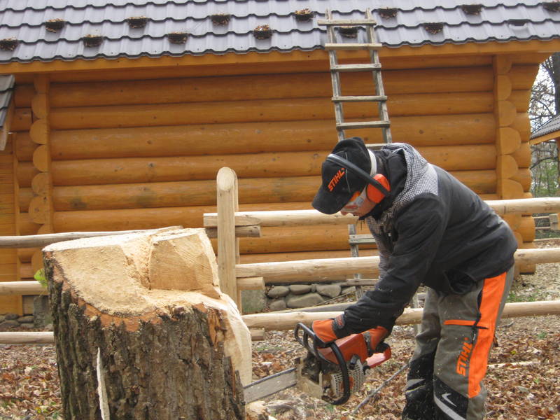 — Чесно кажучи, я і досі не знаю. Якось три роки тому їхав від мами з Херсонщини. і в одному з рибальсько-мисливських господарств побачив різьблену з акації дерев’яну арку. Подумав: якщо на півдні таке можуть робити, то чому б не спробувати в Карпатах. Я сидів вдома, роботи не мав. Найперше взявся із смерекового сукуватого ковбанчика, який мав іти на дрова, зробити ведмедя — маленького, висотою всього 75 сантиметрів. Від батька мені залишилася бензопила — стовісімдесятий «Штіль» зі стандартною шиною для кріплення ланца. Я порізав дві години, зайшов у хату — руки болять. Але не зупинився. Взяв донечку, якій тоді був рочок, на руки, подивилися мультики, і знову взявся до роботи. Робив того ведмедя три дні, а сьогодні мені досить і півтори години.