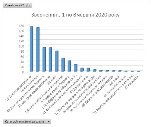 Більшість (173) - щодо електропостачання (відсутнє світло в квартирі та заміна лампочок). Майже така ж кількість звернень (170) щодо будинкової та дворової каналізації. 51 заявка на прочистку дворової була передана в Водоекотехпром.