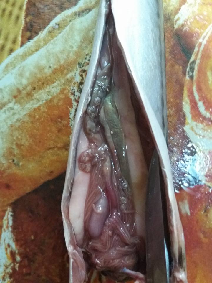 "Сьогодні придбали в Сільпо морожену скумбрію з личинками і хробаками, не купуйте там рибу!!! Репост вітається!", - написала франківчанка, виклавши світлини.
