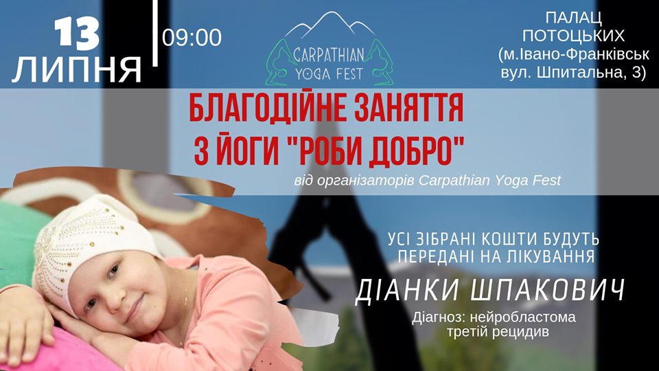 Під час заняття збиратитуть кошти на лікування онкохворої Діани Шпакович, яка 7 років бореться з раком (нейробластома, третій рецидив)..