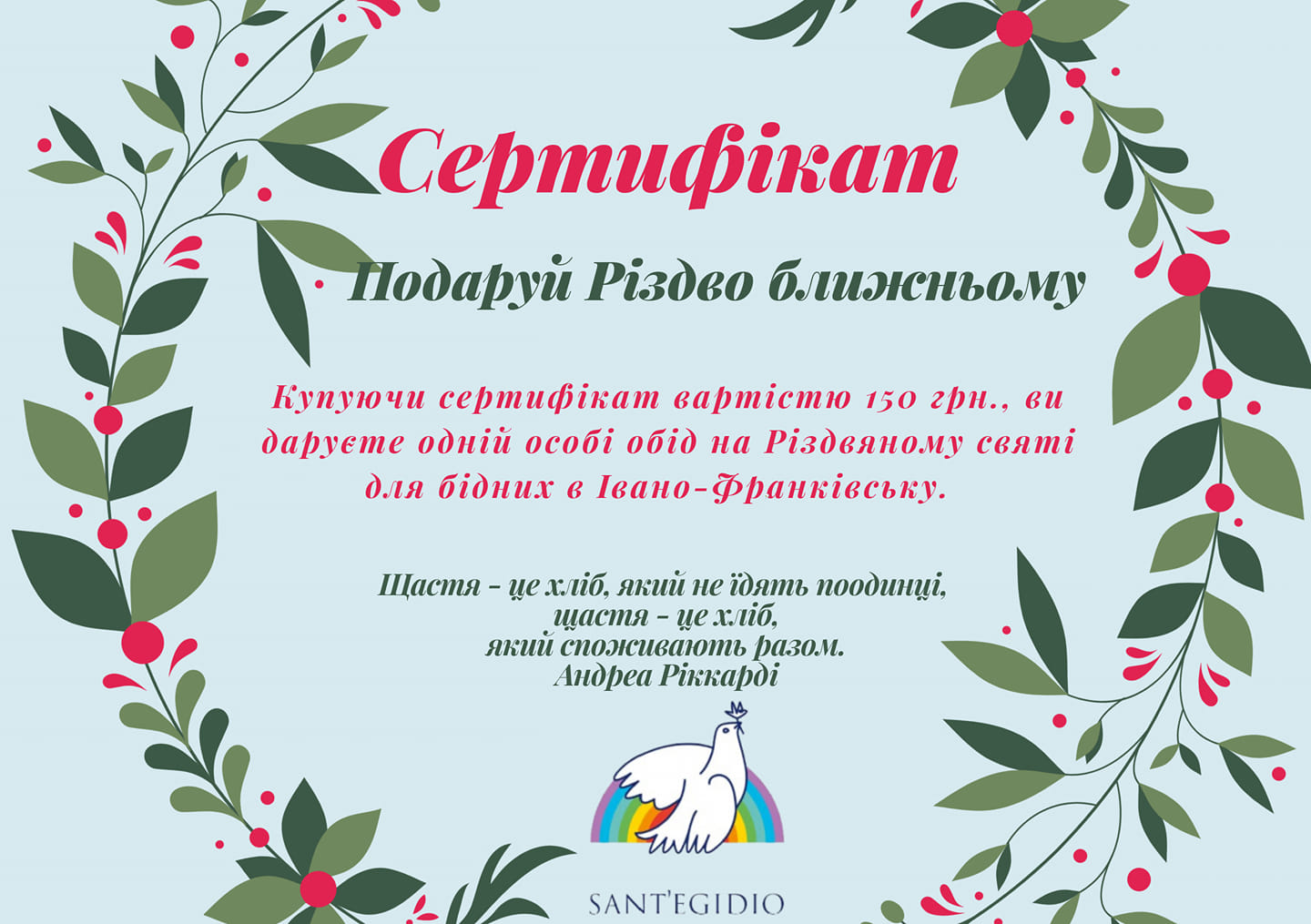 "Придбавши цей сертифікат, ти зможеш пригостити святковим обідом одного бідного чи бездомного. Щоб отримати сертифікат, пиши Ivan Kharuk, Natalia Dorogovych, Uliana Rymaruk, або телефонуй: Уляна 0668331363, Іван 0979336764. Якщо ти не з Івано-Франківська чи не маєш часу на зустріч, але дуже хочеш подарувати Різдво для бідних, то ось наша картка 4149 4991 2082 0376 Зелез Галина Василівна", - написали волонтери.