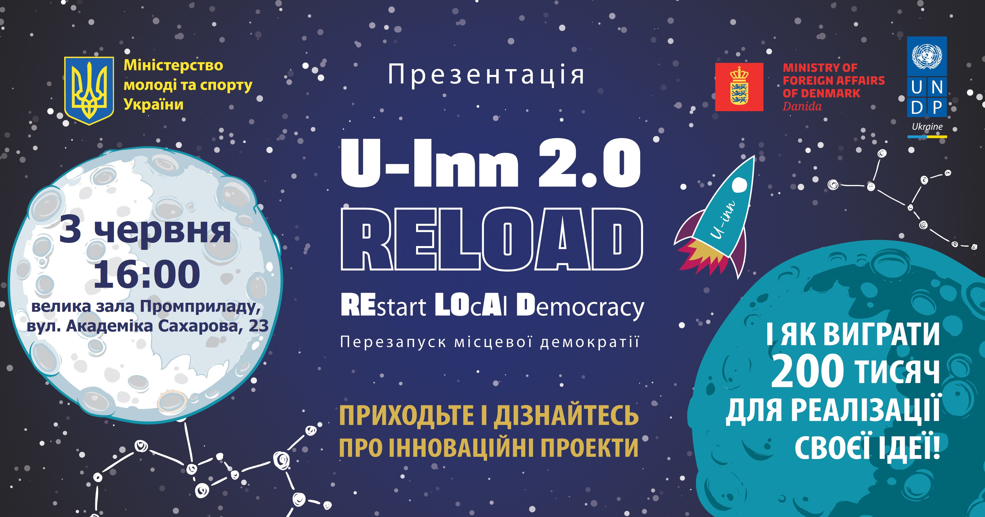 3 червня о 16:00 у великій залі Промприладу відбудеться презентація програми розвитку молодіжних інновації для сприяння доброчесності та інклюзивності U-Inn 2.0:RELOAD (Restart Local Democracy) "Перезапуск місцевої демократії" від Програми розвитку ООН в Україні.