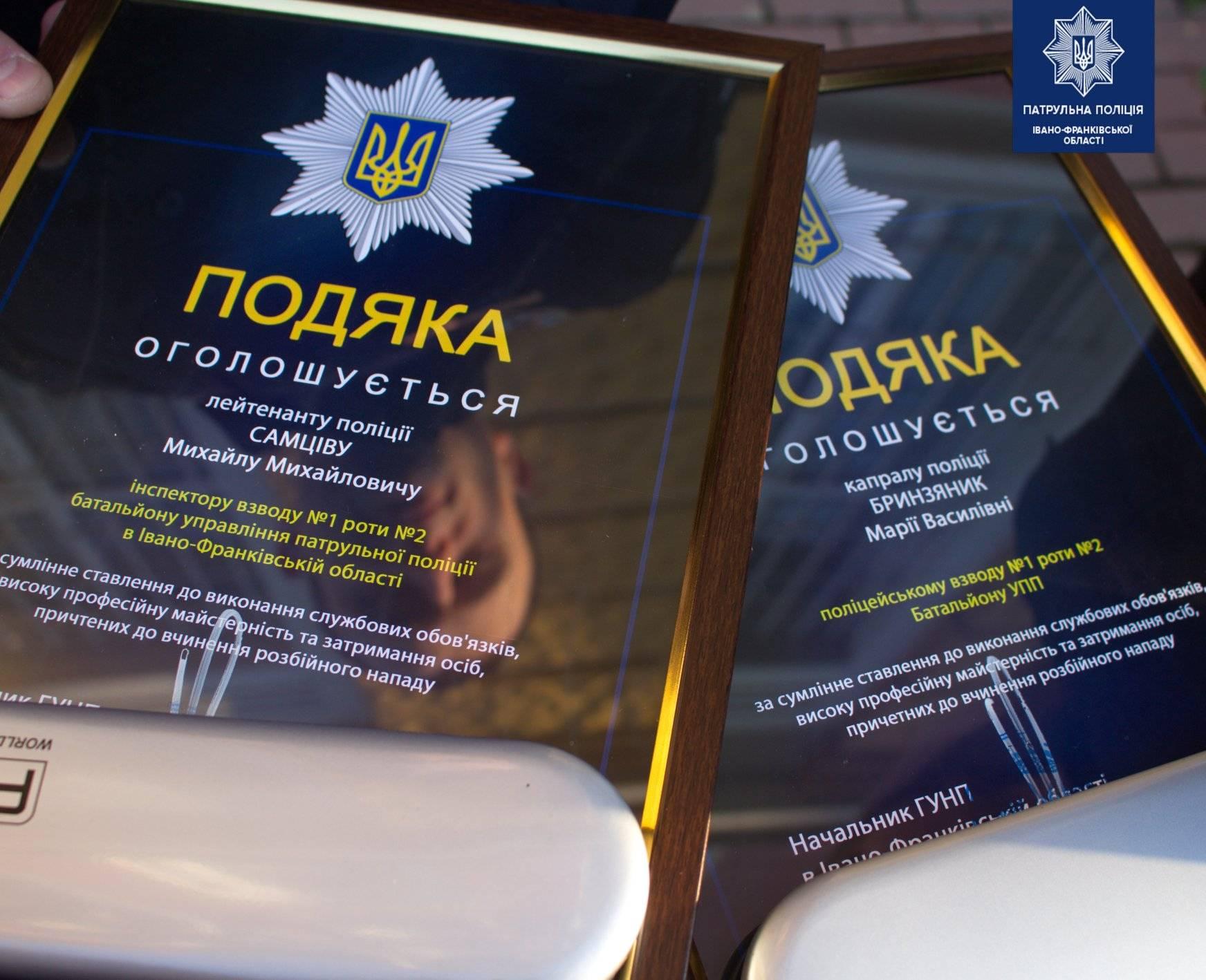 Сьогодні начальник Головного управління Національної поліції у Івано-Франківській області, полковник поліції Володимир Голубош відзначив двох патрульних за сумлінне ставлення до виконання службових обов'язків, високу професійну майстерність та затримання осіб, причетних до вчинення розбійного нападу.