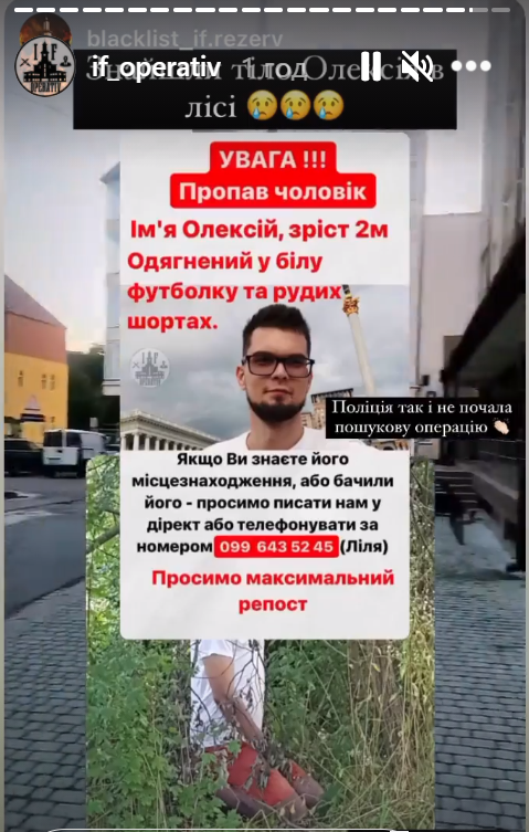 "Ще одна шокуюча новина. Олексія, якого ми всі шукали, знайшли мертвим в лісі. Знайшов мій знайомий разом з дівчиною. Він випадково натрапив на тіло.