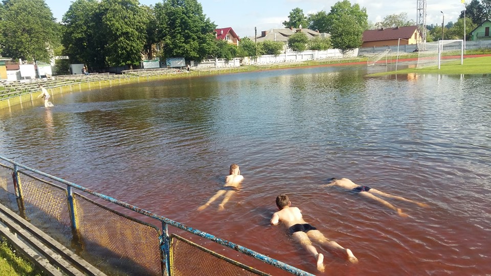 Футбольне поле у Калуші перетворилось на басейн, де плавають люди