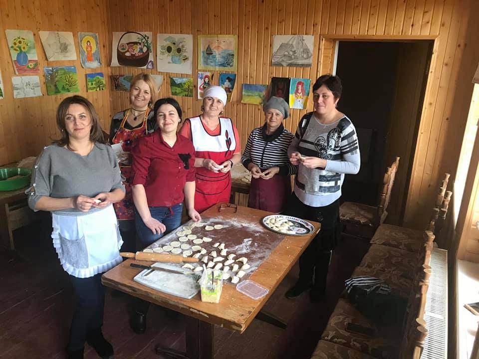 Працівники Делятинської селищної ради та активістки в приміщенні катехитичної школи в Делятині готують 1000 домашніх вареників (з капустою і картоплею).