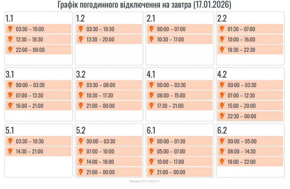 Графік відключення світла на Прикарпатті у суботу, 17 січня