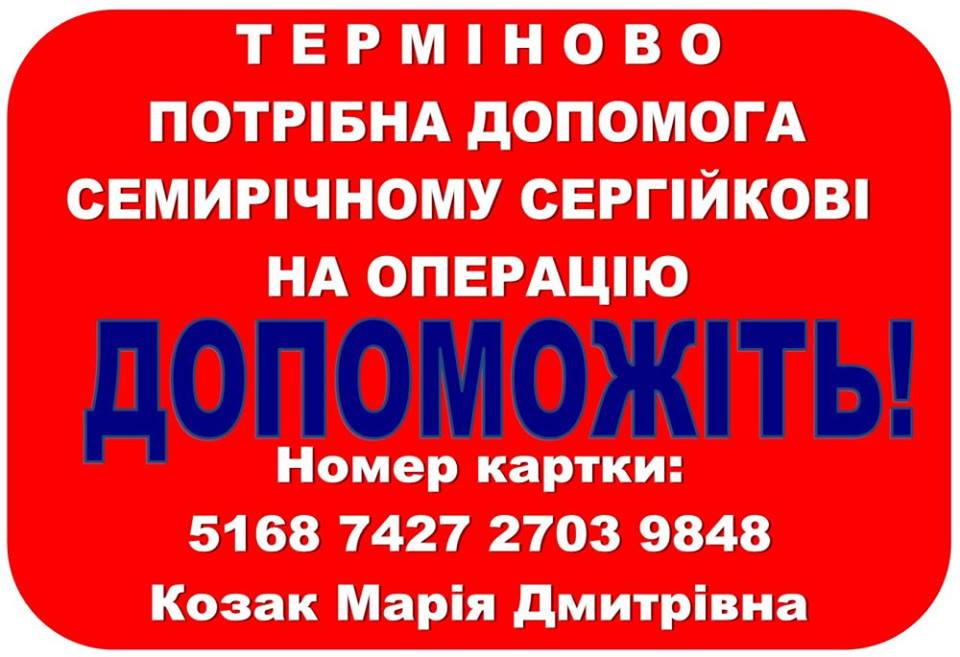 "Закордон пані Марія поїхати не може, бо позбавляють опікунства. З 19.02 до 05.03 2019 року Сергійко проходив лікування в Івано-Франківській обласній дитячій лікарні в хірургічному відділенні. Необхідно оперативне лікування - аугментації сечового міхура (створення сечового міхура з частини кишки, бо сечовий міхур зсихається). Попередню вартість операції в Івано-Франківську сказали 100 000 грн. Дякуємо всім небайдужим людям", - зауважила
