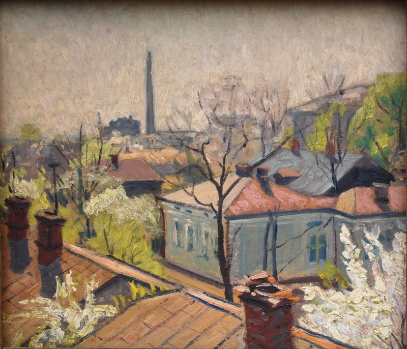 Друга робота майстра, на який ми зупинились, називається «Вид з вікна квартири на вулиці Розумовського» і датована 1968 роком. Довший час художник жив у комуналці на вулиці, яка носила ім’я не українського гетьмана, а радянського генерала. Нещодавно її перейменували у Теодора Цьоклера. Це район так званої Німецької колонії, де збереглось багато старовинних особняків. На передньому плані бачимо будинок № 7 (нині сильно перебудований), позаду темніє школа № 14, а на обрії сторчить димар електростанції.