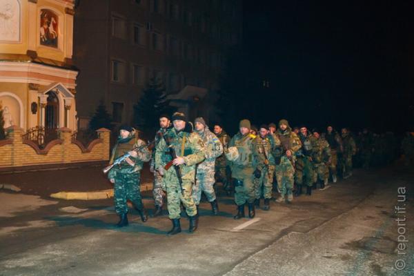 У неділю, 18 січня, близько 02:00 біля управління УМВС іванофранківці зустрічали зведений загін прикарпатських міліціонерів, які повернулися із зони АТО.