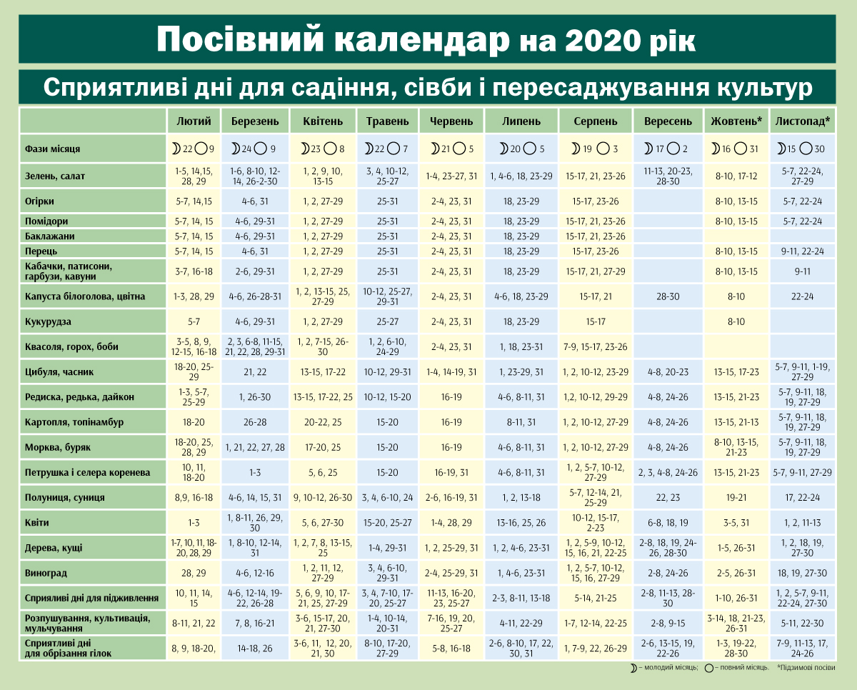 Серед таких і посівний календар на перше півріччя, де вказані сприятливі дні з урахуванням місячних фаз. Перш ніж посадити щось, звіртеся з календарем, і урожай ваш буде багатим і буйним, пише Порадник.