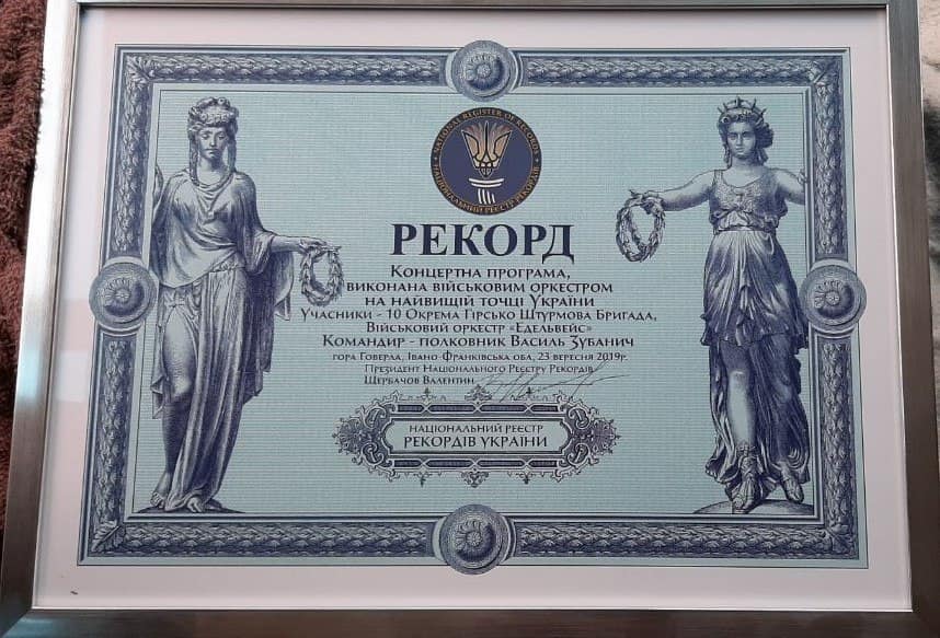"Вчора Національний Реєстр Рекордів України зареєстрував національний рекорд - виконана концертна програма на найвищій точці України! Військовий оркестр Едельвейс вдруге піднявся на вершину гори Говерла (2061м) з музичною програмою та влаштував концерт", - йдеться у повідомленні.