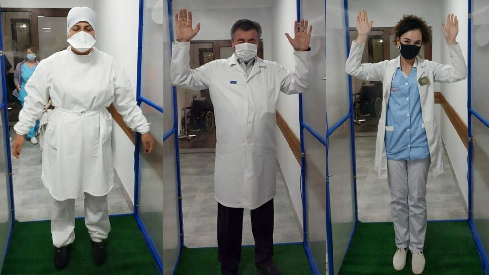 Як кажуть медики, туманоутворююча рамка використовується для дезінфекції одягу працівників лікарні.