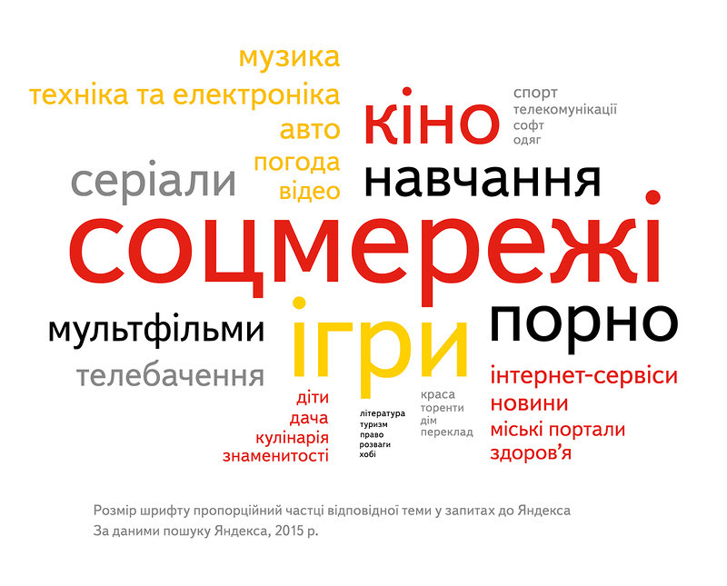 Найпопулярніші теми у пошуку серед іванофранківців – це соцмережі, ігри та кіно. У сумі на них припадає майже чверть усіх запитів до Яндекса. Усупереч поширеній думці, порнозапити – лише на четвертому місці за популярністю.